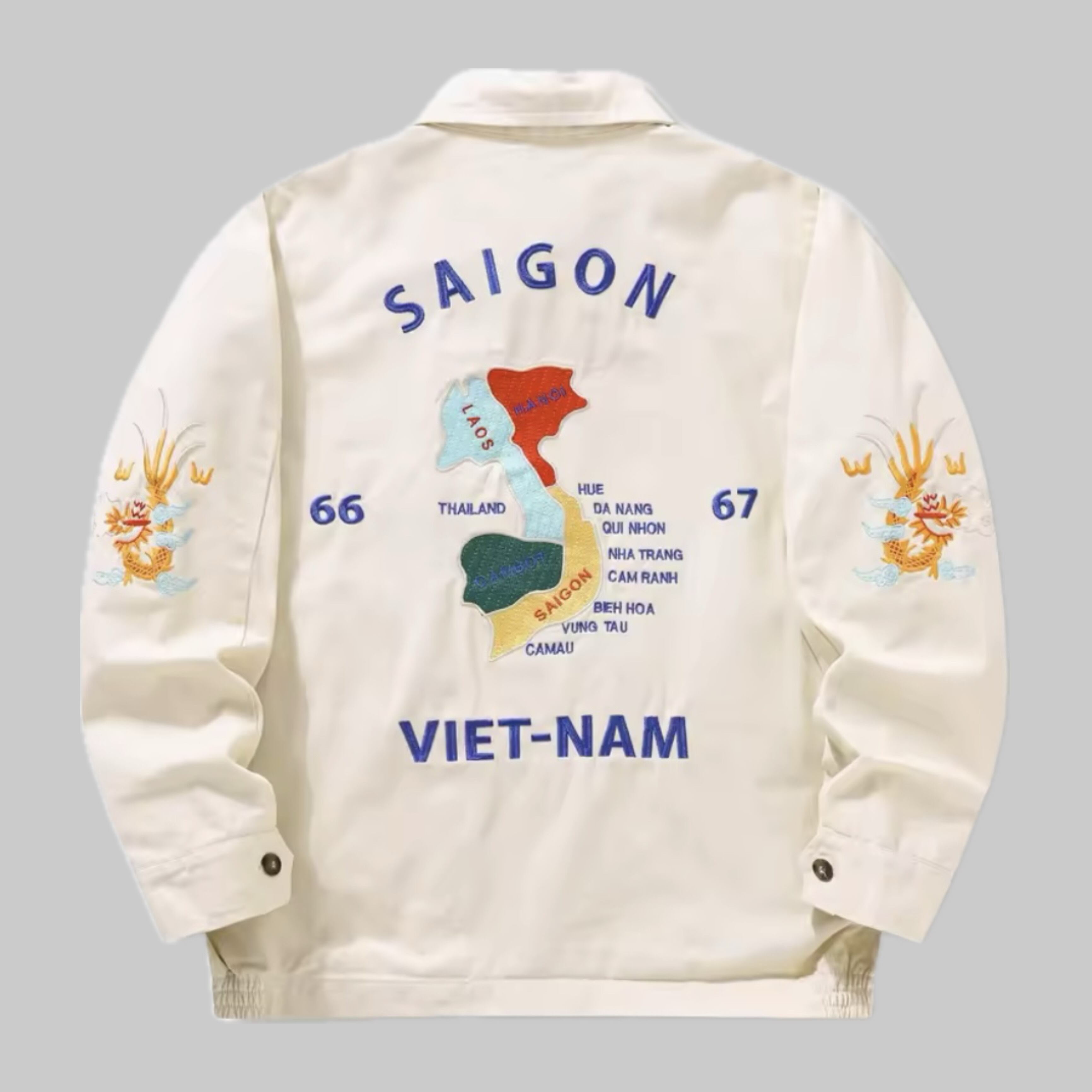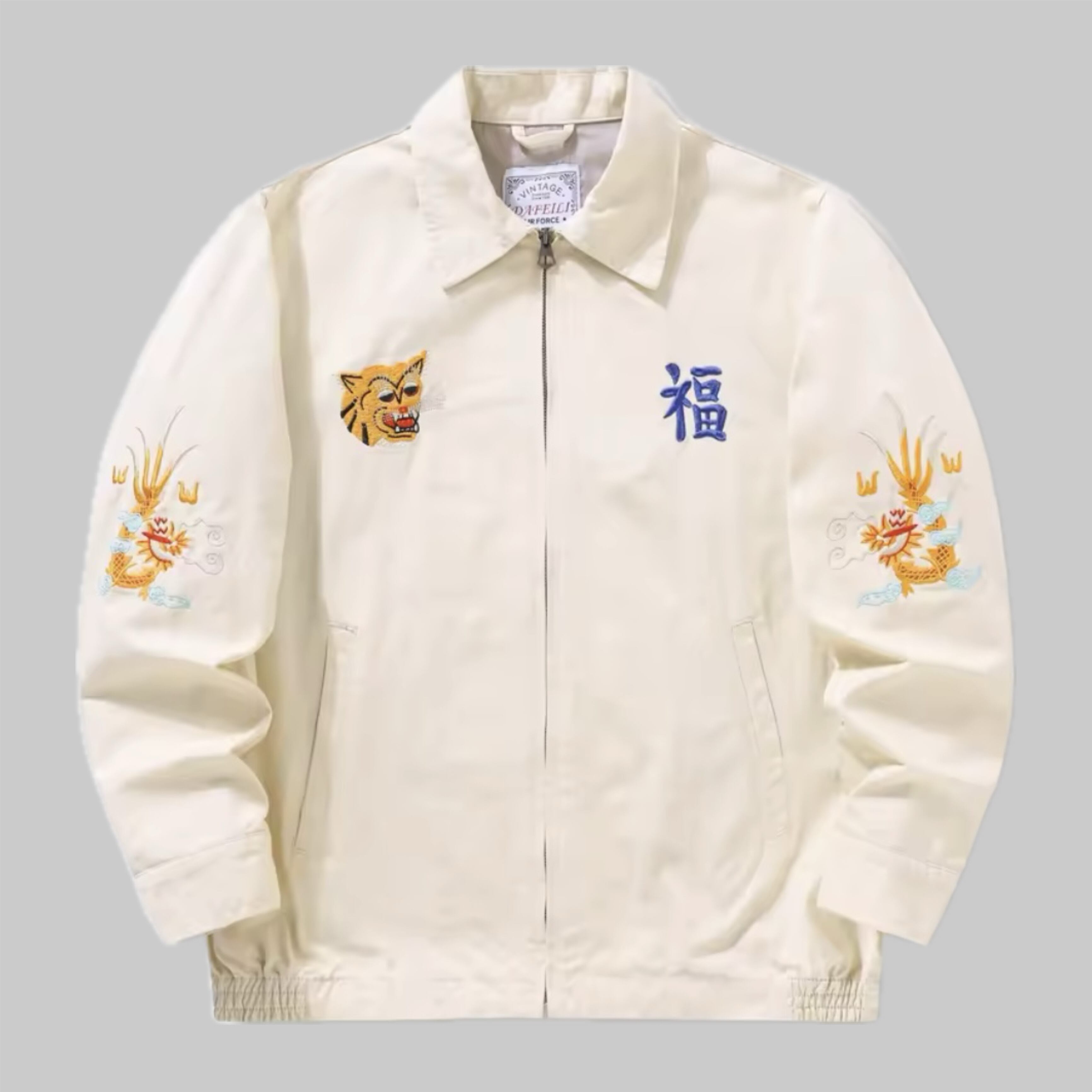 両胸にはキャッチーなヴィンテージ風の虎とベトジャンの王道『福』の刺繍を袖には龍の刺繍をデザインしています!