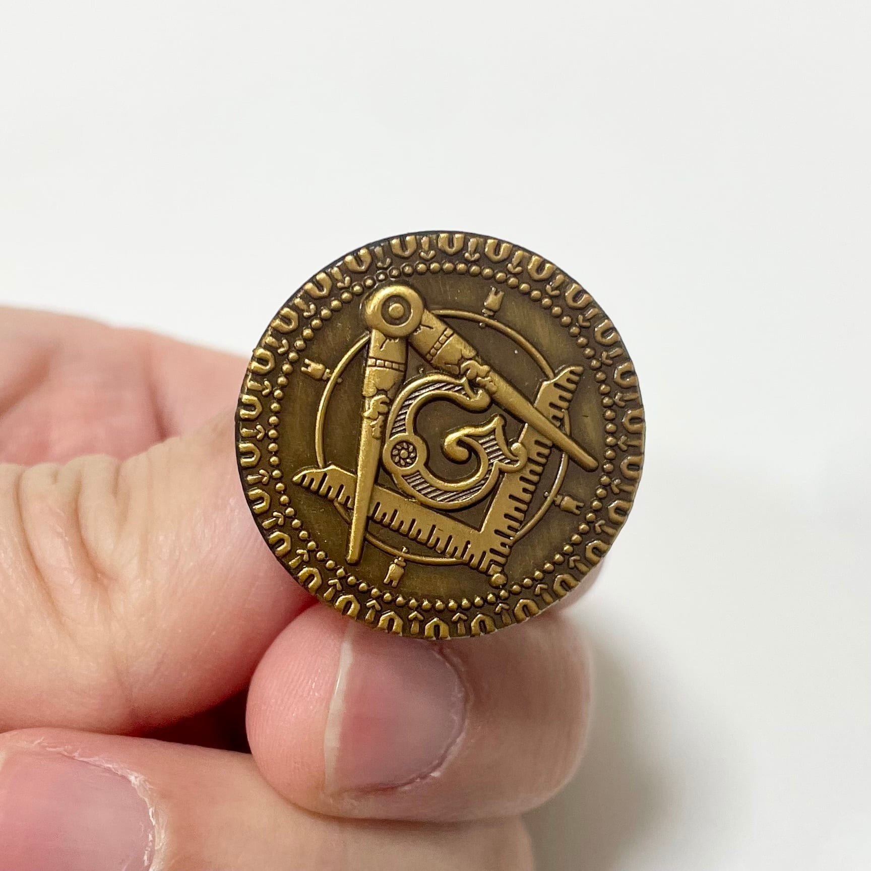 中央には「幾何学」や「神」を意味する「G」の文字が刻まれており、直角定規とコンパスが織りなす独特の幾何学模様は、歴史の深さと神秘的な魅力を感じさせます。