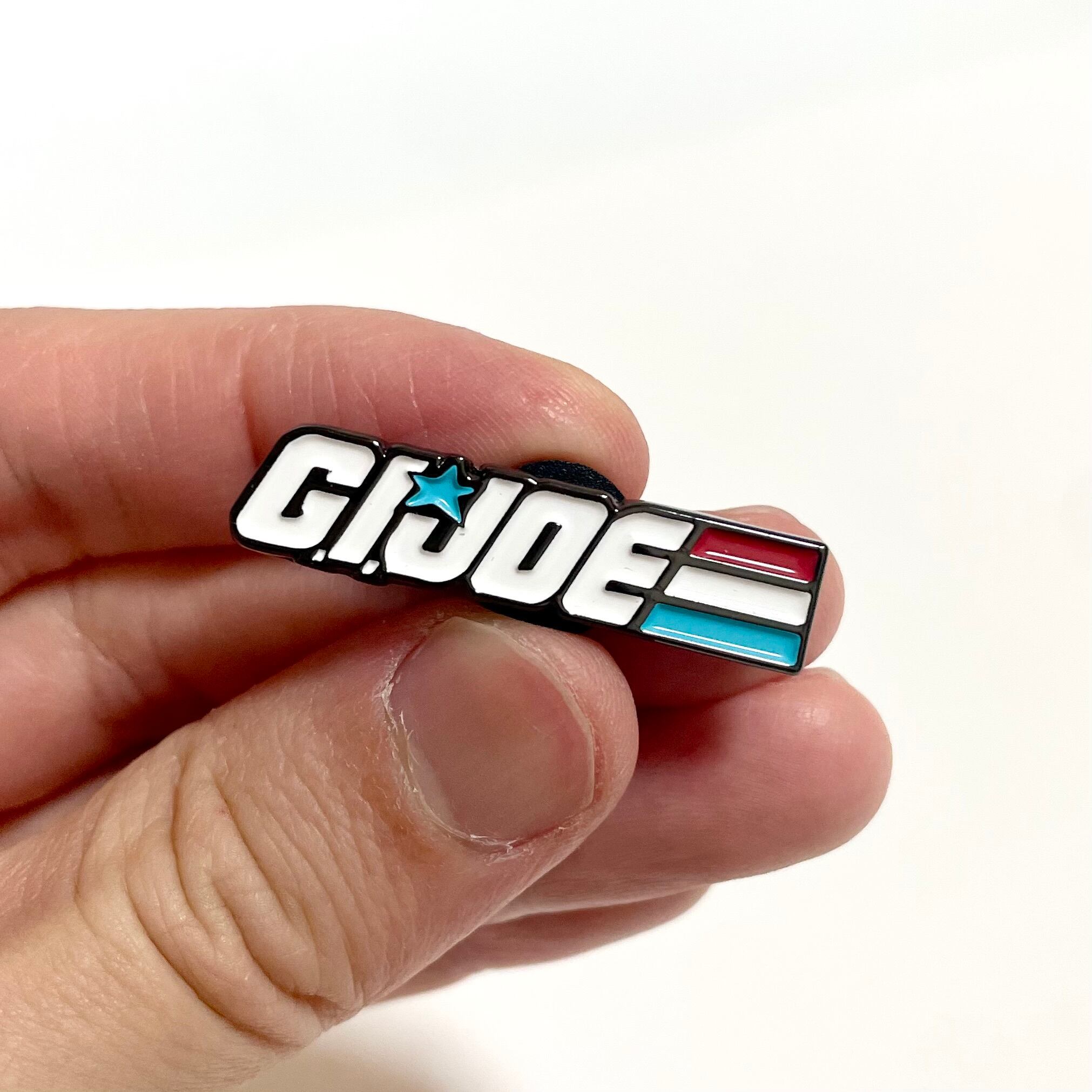 アメリカの人気アクションフィギュア・アニメシリーズ、G.I.ジョー(G.I. JOE)のロゴ型ピンバッジです。