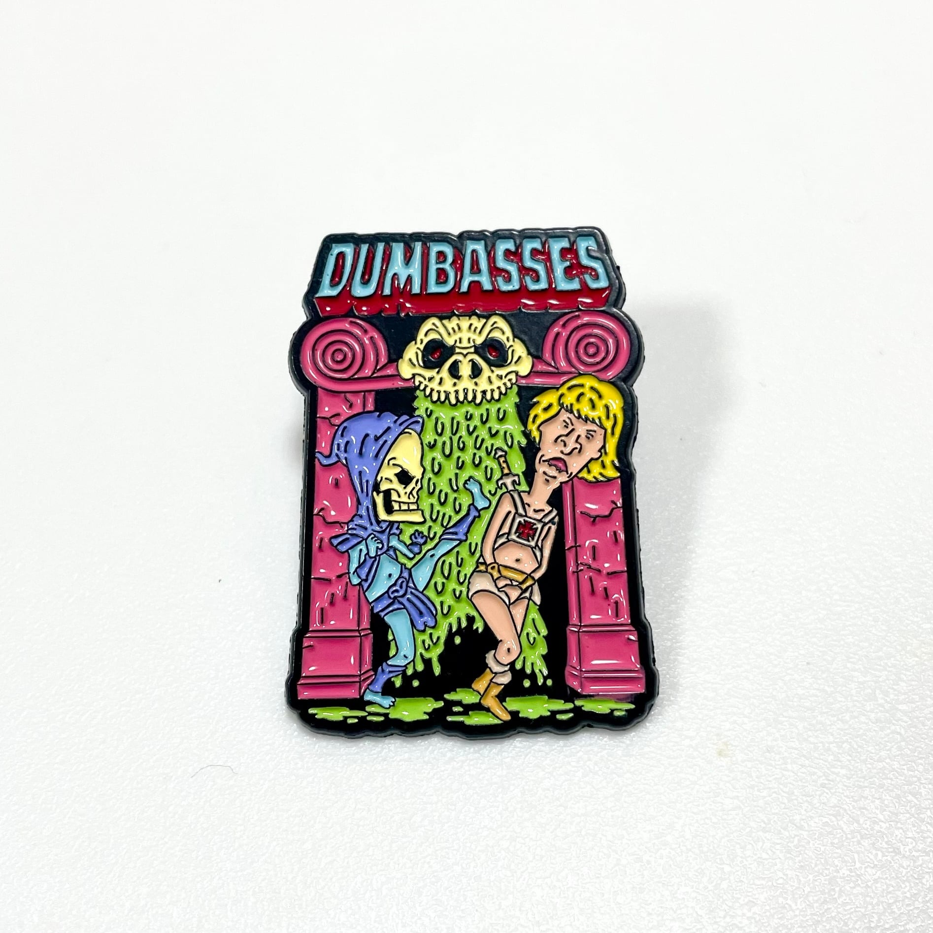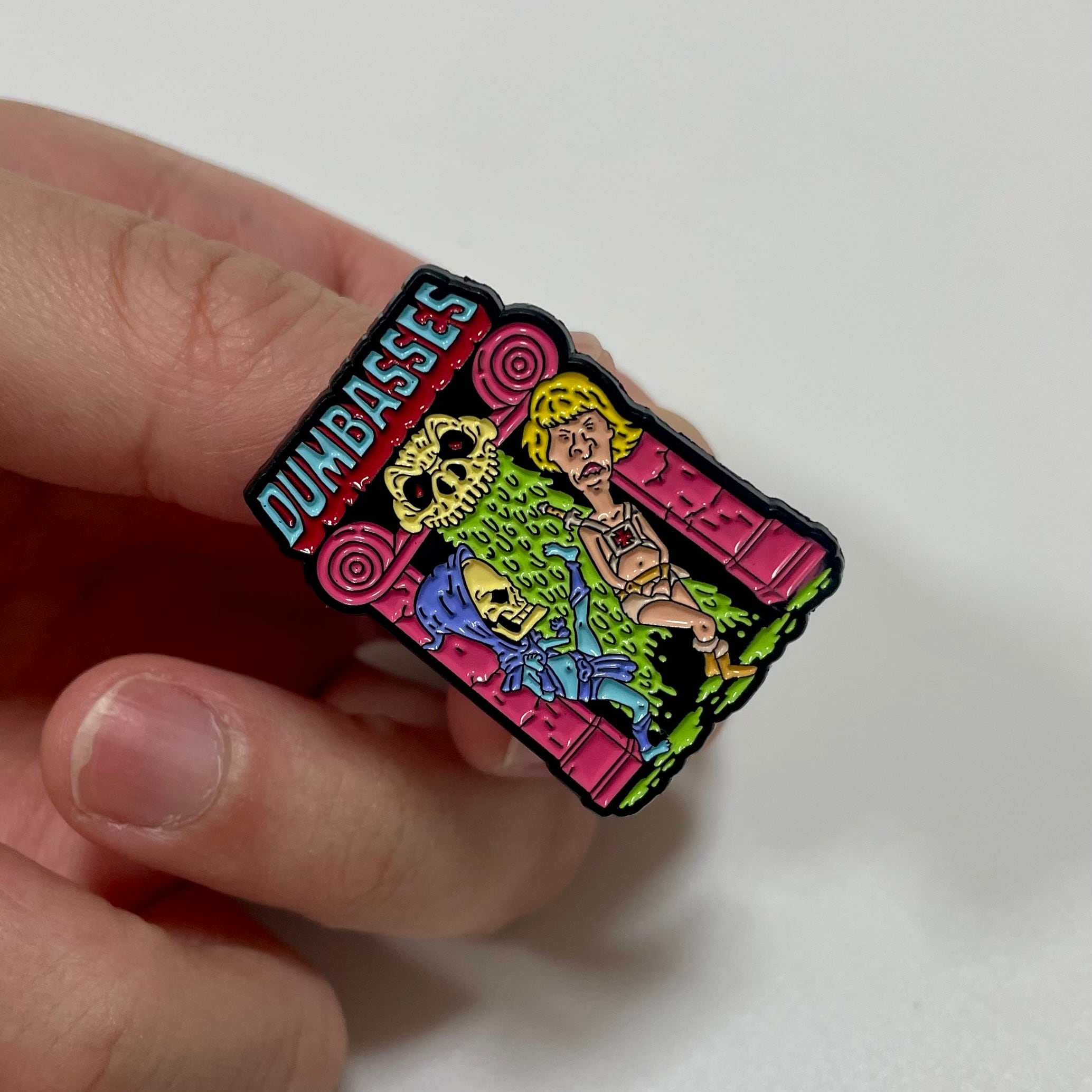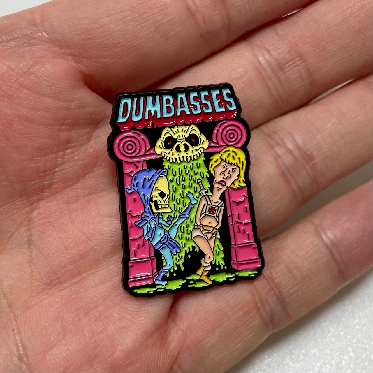 90年代のMTVを象徴するアニメ『ビーバス・アンド・バットヘッド(Beavis and Butt-Head)』と、80年代のファンタジーアニメ『マスターズ・オブ・ザ・ユニバース(Masters of the Universe)』が融合した、エッジの効いたパロディピンバッジです。